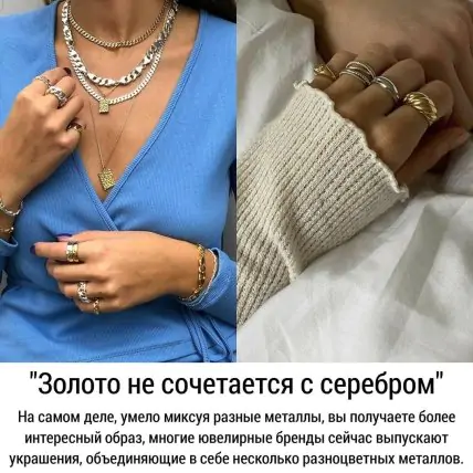 4. Золото не поєднується зі сріблом. Уміло міксуючи різні метали, ви лише робите образ цікавішим. Багато ювелірних компаній зараз випускають прикраси з кількох різнокольорових матеріалів.