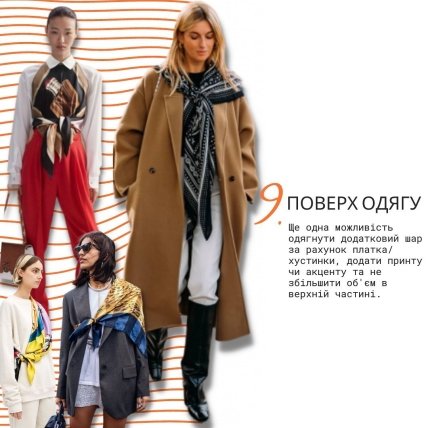Тоді як хустка, одягнена як верхній шар, наприклад, на пальто, додасть образу яскравий акцент. Цей прийом добре підходить для осені, яка вже не за горами.