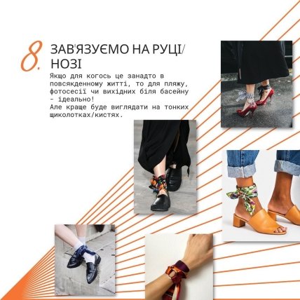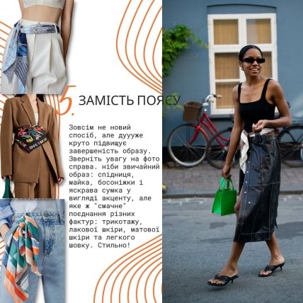 Не секрет, що правильно підібрані аксесуари можуть підвищити градус стилю у будь-якому образі. Різноманітні хустки — предмет гардеробу, як літнього, так і осіннього, можна носити досить нестандартно. Завдяки модним прийомам ви виглядатимете дуже стильно.
