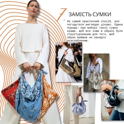 А ось косинка, яку ви пов’язали зверху сумки, додасть вашому образу нотки паризького шарму. Якщо ви хочете поекспериментувати, то хустка взагалі може замінити сумку: оригінальнішого варіанту не придумаєш.