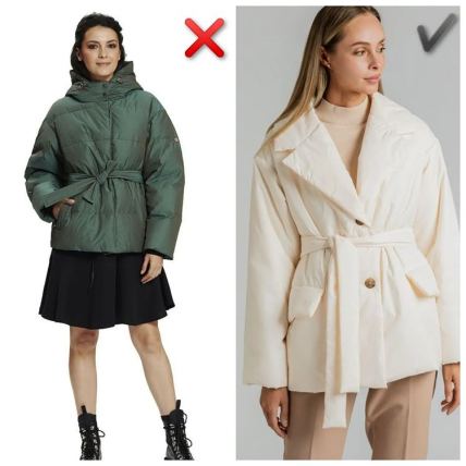 - Пояс найлогічніше виглядає на пуховиках з англійським лацканом. На об’ємно-спортивних — зайвий