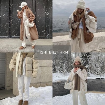 - Різні фактури. Світлий колір відбиває світло, тому гладкі білі речі виглядають плоско. Тому сміливо використовуємо різні фактури: пухнаста шубка, шкіряні штанці, фактурна в’язка шарфу та шапки – все це зробить образ гармонійнішим.