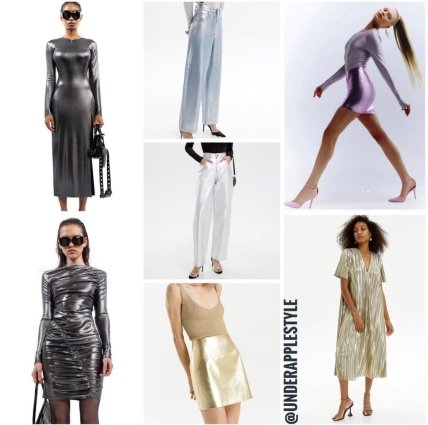 - Металізовані тканини — не обов’язково носити тотал метал, достатньо вибрати одну річ, яка стане акцентом.