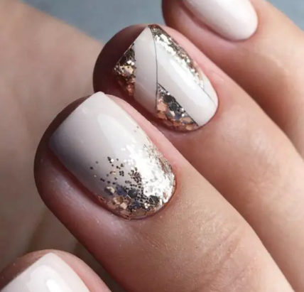Срібні і золоті блискітки на нігтях мають гарний вигляд на молочній й білій базі. Золото – це успіх у всіх починаннях, а срібло – справедливість і чесність.