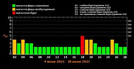 Водночас, астросиноптики з сайту Tesis.xras оприлюднили оновлений графік геомагнітних штормів на червень. За їх словами, землян у першому місяці літа очікують 5 магнітних збурень силою 4 балів — 2, 4, 19, 20 та 25 червня та 1 слабку магнітну бурю 5 балів — 18 червня.