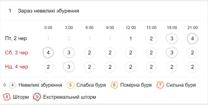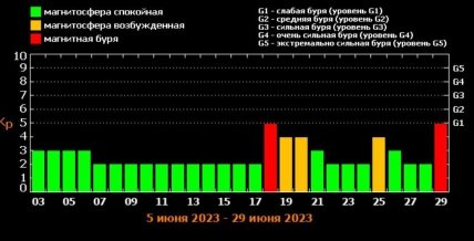А от працівники сонячної лабораторії Tesis.xras заперечують можливість виникнення магнітних бур чи збурень найближчими 15 днями. Однак, після тиші синоптики прогнозують хвилю геомагнітних штормів. 18 червня очікується слабка магнітна буря 5 балів потужності, а 19 та 20 червня вона зменшиться до збурення 4 балів.