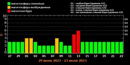 На другому тижні прогнозується магнітна буря: почнеться 12 липня (слабка), а наступного дня її потужність збільшиться до середньої. Однак після дводенного шторму на Землі запанує геомагнітна тиша.