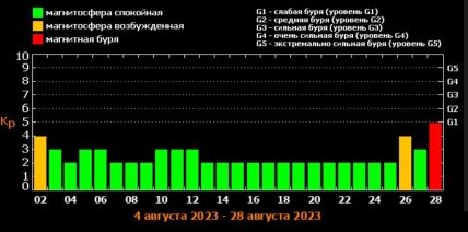 За даними сайту, у першій декаді третього місяця літа земляни чекають на невелике збурення — 2 серпня. Протягом наступних 20 днів геомагнітна активність на Сонці буде малою, однак 26 серпня відбудеться поновлення збурення 4 балів.