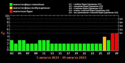 За даними сайту, протягом понад 20 днів геомагнітна активність на Сонці буде малою, однак 26 серпня відбудеться невелике збурення 4 балів потужності. Після того, 27 та 28 серпня на нашій планеті пануватиме магнітна буря 5 балів потужності.