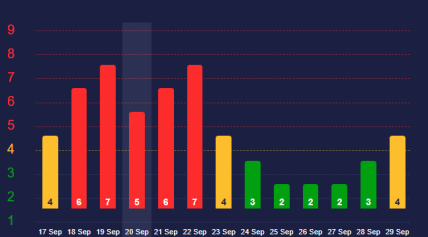 Найближчі три дні на Землі буде велика магнітна активність. 20 вересня сила геомагнітного шторму сягає 5 балів потужності, тобто слабка. Наступного дня (21 вересня) він збільшиться до 6 балів, а 22 вересня — зафіксується на рівні 7 балів.