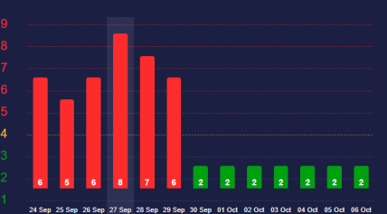 Окрім того, як повідомляють фахівці з сайту Meteoagent, геомагнітний шторм триватиме 27-29 вересня. Окрім того, сьогодні відбудеться надпотужна магнітна буря з поміж інших днів, до 8 балів потужності. Після того, 28 вересня, вона зменшиться до 7 балів, а наступного дня — до 6 балів.