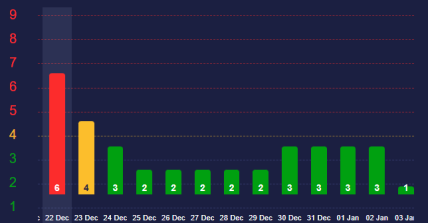 Згідно з ним, на нашій планеті 22 грудня тримається магнітна буря, яка сягає 6 балів потужності. Після того, 23 грудня, прогнозується послаблення шторму до невеликого збурення 4 балів.
