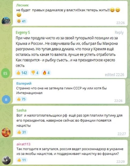 Користувачі мережі ж згадали зв’язки Ле Пен з росією і поцікавилися, чому вона не заспівала гімн СРСР.
