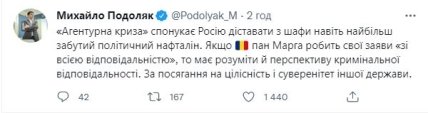 Як повідомив портал Agerpres з посиланням на пресреліз зовнішньополітичного відомства Румунії, у відомстві зазначили, що позиція Марги "зухвало суперечить" офіційній позиції Бухареста щодо російського вторгнення в Україну та основоположних принципів міжнародного права.