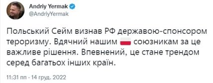 Як повідомлялося раніше, 23 листопада на черговій пленарній сесії Європейського парламенту було ухвалено рішення визнати росію спонсором тероризму. Двома днями раніше таке ж рішення було затверджено Парламентською асамблеєю НАТО.