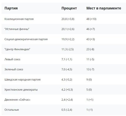 Як повідомляє фінське видання Yle, найбільше місць втратили центристи (-8 мандатів) і зелені (-7), що входили в уряд. Також ліві, які працювали в останньому кабінеті міністрів, втратили п’ять місць.