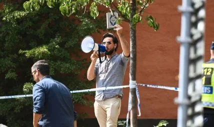 Спочатку він увімкнув шведський гімн і розмахував державним прапором, а потім почав виривати сторінки з Корану, класти на них шматки бекону, а потім підпалював їх цигаркою.