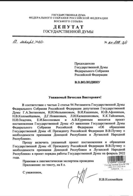 У Росії можуть визнати "правовими республіками" терористичні об’єднання "ДНР" та "ЛНР", які захопили частину Донбасу. Із такою пропозицією до Володимира Путіна 19 січня звернулася частина депутатів Держдуми.