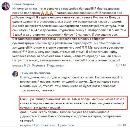 "Я їздила на впізнання свого сина в Ростов-на-Дону. Ви собі не уявляєте якими партіями приходять хлопці звідти. Мій син служив у 247дшп м. Ставрополя! Я була там 5 днів і за цей час поховали понад 40 людей", — пише одна із матерів загиблого в Україні російського солдата.