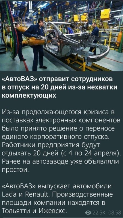 Через розгортання бойових дій на українських територіях практично щодня проти росії вводяться дедалі нові санкції. Багато міжнародних компаній відмовилися постачати свої товари в рф, від чого почали страждати російські підприємства. Наприклад, автомобілебудівної компанії "АвтоВАЗ" довелося перенести єдину корпоративну відпустку з літа на квітень через відсутність постачання комплектуючих.