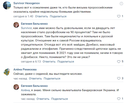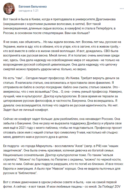 Пост-порівняння до і після Більченко опублікувала на своїй сторінці у заблокованій в Україні соцмережі "Вконтакті". "Ось такою я була в Києві, коли я викладала в університеті Драгоманова (нафарбована з коротким рудим волоссям, у хіпі). Ось така (ненафарбована, довге сиве волосся, у камуфлі) я стала в Петербурзі, в росії, в основному після спецоперації. Як вам більше?", — написала Більченко. У коментарях вона похвалилась, що тепер у неї "очі щасливі", а на зовнішність їй стало байдуже.