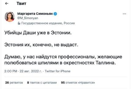 Варто зазначити, що російська ФСБ звинуватила у підриві Дугіної нібито громадянку України Наталю Вовк, яка служить у Нацгвардії. Російські пропагандисти вже почали наперебій сипати погрозами в бік Естонії, куди нібито виїхала жінка після злочину, який їй приписали.