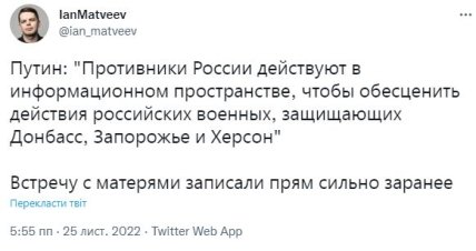 Як повідомлялося раніше, під час розмови з "матерями солдатів" путін видав черговий фейк про ЗСУ, заявивши, що в Україні не зважають на втрати і використовують солдатів, як гарматне м’ясо.