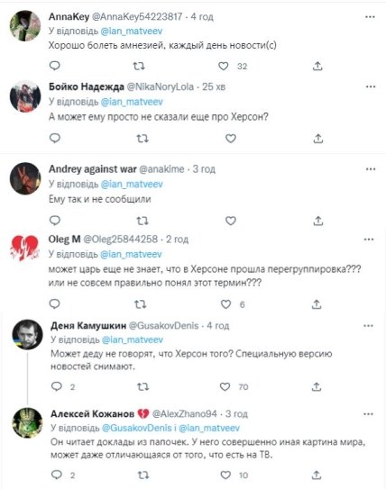 Інші користувачі мережі після цього почали висувати свої припущення про те, що путін продовжує жити в якійсь своїй реальності або що йому забули доповісти про т.зв. "відведення військ".