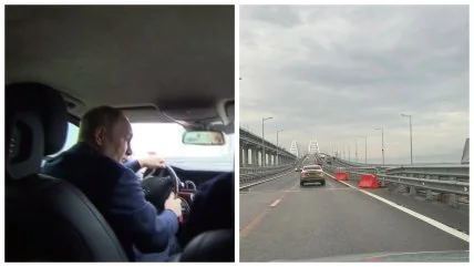 На відео путін за кермом Mercedes запитує у віцепрем’єра Марата Хуснулліна про пошкоджену ділянку Кримського мосту. Хуснуллін відразу доповів главі кремля про ремонтні роботи на стратегічному об’єкті інфраструктури.