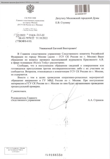 Ступін нагадав, що глава СК олександр бастиркін після скандалу заявив, що особисто займеться розслідуванням справи. За словами депутата, цим словам він не повірив спочатку, а тому написав особисте звернення про притягнення красовського до кримінальної відповідальності і пообіцяв підключити прокуратуру.