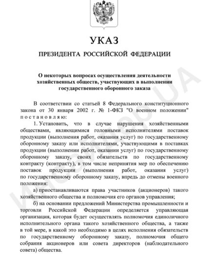 Президент російської федерації володимир путін вперше прямо послався на воєнний стан, який він ввів у жовтні 2022 року, у своєму указі про зрив оборонного замовлення.