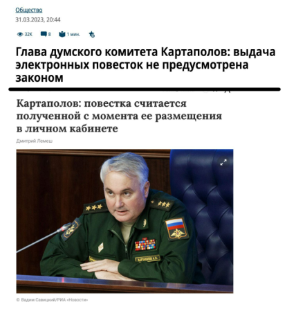 Голова думського комітету з оборони Андрій Картаполов ще тиждень тому запевняв, що видача електронних повісток не буде передбачена законом. Але плани змінилися кардинально: сьогодні він сказав, що повістка вважається врученою з моменту появи у смартфоні: