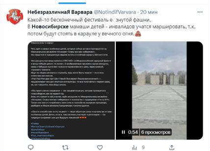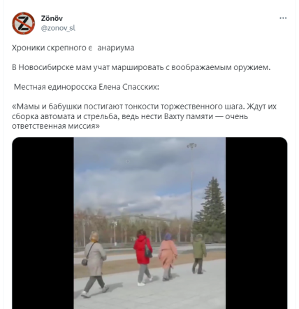 Поки російські окупанти запускають ракети і вбивають українських дітей, у Новосибірську матері дітей з інвалідністю вчаться маршувати з уявною зброєю в руках на військово-патріотичній акції, щоб стати у варту на Посту №1 біля Вічного вогню на 9 травня.