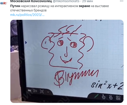 Після цього путіна попросили знову залишити малюнок, але вже на вітчизняному екрані. На що президент країни-агресора охоче погодився і почав малювати незрозумілу істоту з очима, носом та посмішкою.