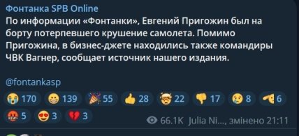 Про це повідомляє російське видання "Фонтанка". А так званий "глава" адміністрації Запорізької області володимир рогов підтвердив загибель євгена пригожина.