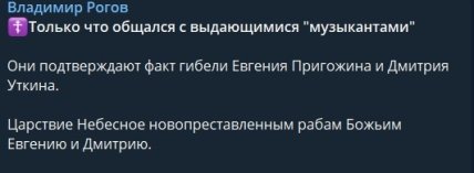 А колаборант володимир рогов повідомив, що особисто спілкувався з "видатними музикантами", тобто найманцями з ПВК "Вагнера" і ті підтвердили факт загибелі євгена пригожина і дмитра уткіна.