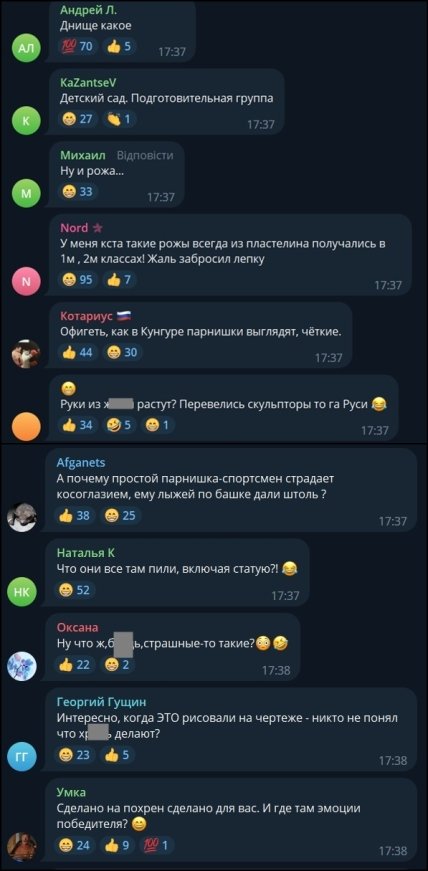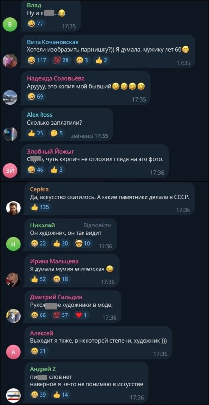 "Я думала мужику 60 років", "Копія мій колишній", "Так, мистецтво скотилося. А які пам’ятники робили в СРСР", "Виходить я теж, певною мірою, художник", "Напевно, я щось не розумію в мистецтві", "Ну і пика…", "Дитячий садок", "Днище", "А чому простий хлопчина-спортсмен страждає на косоокість, йому лижую по голові дали чи що?", "Що ж страшні такі?", "Що вони всі там пили, включаючи статую?", — пишуть у коментарях.