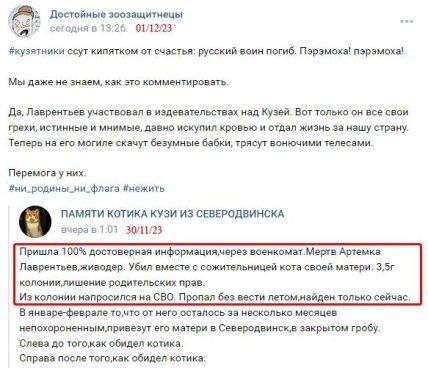 "Пропав безвісти влітку, знайдений тільки зараз. У січні-лютому те, що від нього залишилося за кілька місяців непохованим, привезуть його матері до Сєвєродвінська, у закритій труні", — повідомили в інтернет-спільноті, яка присвячена вбитому коту Кузі.