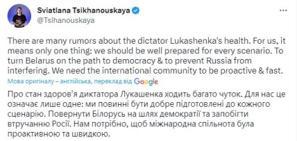 "Про стан здоров’я диктатора лукашенка ходить багато чуток. Для нас це означає лише одне: ми маємо бути добре підготовлені до будь-якого сценарію", — написала вона.
