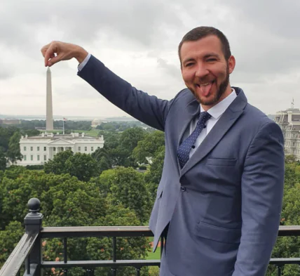На фото Никифоров стоїть на оглядовому майданчику навпроти Білого дому і, висолопивши язика, нібито тримає кінчиками пальців верхівку монумента (це фото друге в галереї).