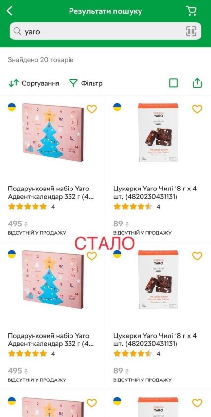 "Ще учора Rozetka продавала 56 найменувань Yaro, і в наявності були вони майже усі, та сьогодні протягом дня більшість товарів було видалено, а на всіх 20, які ще показує у пошуку стоїть позначка «відсутній у продажу». Це єдине правильне рішення, яке може бути в такій ситуації", — написав Стерненко і прикріпив відповідні фото.