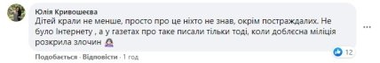 "Дітей крали не менше, просто про це ніхто не знав, крім постраждалих. Не було Інтернету, а в газетах про таке писали лише тоді, коли доблєсна міліція розкрила злочин", — зазначила Юлія Кривошеєва.