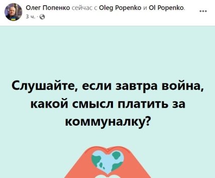 Голова Спілки споживачів комунальних послуг Олег Попенко на своїй сторінці у Facebook пропонує не платити за комуналку: