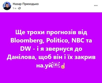 Політичний експерт Назар Приходько також оцінив прогнози Bloomberg, Spiegel, Politico, NBC та заявив, що незабаром звернеться до Данилова з проханням закрити ЗМІ.
