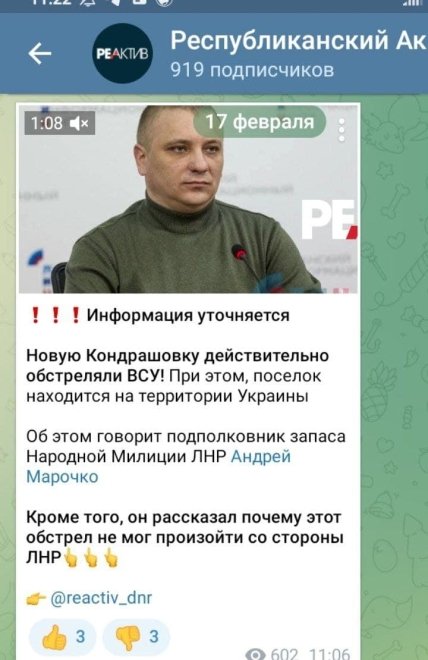 Одразу після обстрілу бойовиків ті повідомили, що стріляли нібито не вони. Місцеві паблики у Телеграмі перекрутили інформацію так, що НП нібито сталася у неіснуючому селищі Нова Кондрашівка. У Луганській області існує лише подібна залізнична станція, та й з іншою назвою — Кондрашевська-Нова. А знаходиться вона поблизу Станиці Луганської – на підконтрольній Україні території.