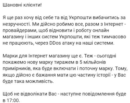 У свою чергу гендиректор держпідприємства Ігор Смілянський у своєму Телеграм -каналі написав, що сайт не працює через DDos-атаку і що марки ще є в наявності.