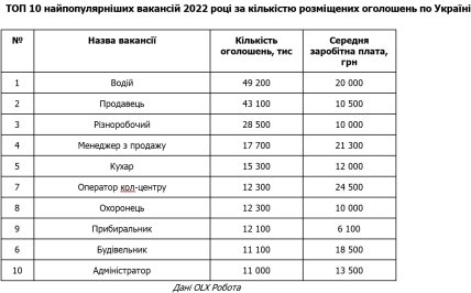Найчастіше роботодавці шукали працівників у сфері "Роздрібна торгівля/Продажі/Закупівлі на OLX Робота" — понад 107 тисяч оголошень на рік, з яких понад 43 тисячі вакансій припали на продавців. Щоправда, зарплата останніх не надто велика – у середньому таким фахівцям пропонували зарплату 10,5 тисяч гривень.