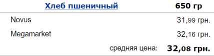 За даними Мінфіну, станом на 1 січня середня ціна на пшеничний хліб у великих українських супермаркетах становить 32,08 грн/650г. За останній місяць вартість зросла на 71 копійку.