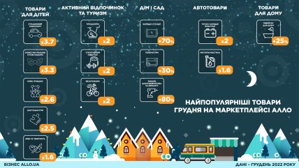 Як повідомляє національний маркеплейс "Алло", у грудні найчастіше купували товари до Нового року. Це були подарунки дітям, автотовари, товари для активного відпочинку та туризму, будинки та саду.