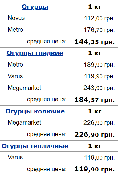 Ціни на огірки в супермаркетах